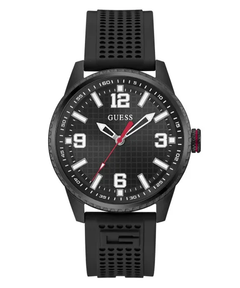 The Guess® Analogue 'Varsity G' Men's Watch GW0890G2 seamlessly combines rugged style with modern sophistication, making it an ideal choice for the contemporary man. Built for the bold, this timepiece features a robust design that speaks to both personality and purpose. The black stainless steel case measures 42mm in diameter and is complemented by a striking black dial, ensuring visibility and elegance at a glance. Crafted with precision, the watch showcases quartz movement, guaranteeing reliability and accuracy for every occasion over time. A thickness of just 10mm contributes to its sleek profile without compromising durability. Comfort is paramount with the silicone band, designed for both style and wearability. Measuring 21cm in length and 22mm in width, this black band features a secure buckle clasp for a perfect fit. With a water resistance of up to 5 bars, this watch is suitable for daily wear and can withstand splashes or brief immersion, making it as versatile as it is stylish. Designed for men who appreciate quality, the mineral glass window protects the face of the watch while adding to its overall durability. The Varsity G is a perfect representation of Guess’s commitment to superior craftsmanship and innovative style. Whether you’re dressing up for a meeting or heading out for a casual outing, the Guess® Analogue 'Varsity G' Men’s Watch is more than just an accessory; it's a statement. Stand out with confidence knowing that you are sporting a watch that transcends ordinary timekeeping, capturing the essence of both functionality and aesthetic appeal.