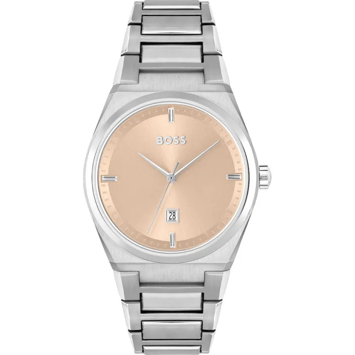Elegance is redefined with the Hugo BossĀ® Analogue 'Steer' Women's Watch 1502670, a striking embodiment of sophistication and style. This exquisite timepiece features a delightful blend of modern and classic aesthetics designed for the contemporary woman. The round stainless steel case, with its gleaming silver finish and a perfectly proportioned diameter of 36mm, encases a captivating rose gold dial, showcasing an aura of refined grace. With a delicate thickness of 8mm, this watch remains effortlessly lightweight while making a bold statement on the wrist. The watch is powered by a reliable quartz movement, ensuring precise timekeeping and ease of use. An attractive fold-over clasp with a push button secures the watch snugly on your wrist, providing both comfort and style. The 19cm stainless steel band glistens with every movement, enhanced by its polished silver hue, making it suitable for any occasion, whether it’s a formal gathering or a casual outing. With a water resistance of up to 5 bars, you can wear this beauty without worry, while the calendar feature adds practicality to its chic design. The mineral glass window adds durability, protecting the elegantly crafted dial. This timepiece is designed for the fashionable woman who appreciates quality and elegance, making the Hugo BossĀ® Analogue 'Steer' a must-have accessory.