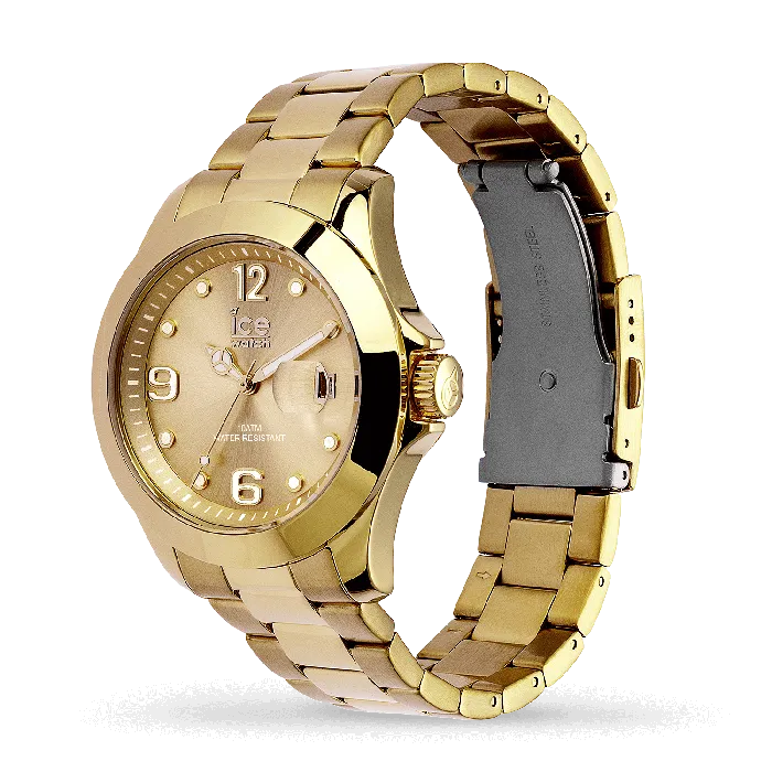 The Ice Watch Analogue 'Gift Box - Ice Steel - Classic Gold - M - Multicolour Jewel' blends elegance with sports chic, perfect for the modern woman who wants to make a striking fashion statement. This exquisite women's watch is crafted with a lustrous gold stainless steel case and a matching band that radiates sophistication. At 40mm in diameter and 12mm thick, the watch's round case is not just a stylish accessory but also robust enough for everyday wear. The golden dial features a classic analogue display, elegantly framed by a mineral glass window designed to withstand the rigors of daily life, maintaining its beauty through wear. A date calendar function adds practicality to the luxurious design. The watch is water-resistant up to 10 bars, making it suitable for various activities. With a total band length of 19 cm and a width of 19 mm, it is designed for comfort while ensuring a secure fit with its fold-over clasp equipped with a push button. This watch is a treasure that embodies both functionality and glamour, reflecting the essence of a woman who knows her worth and isn’t afraid to embrace it. Whether for a casual outing or a formal event, this piece beautifully merges utility with high fashion, making it a must-have accessory in any jewelry collection.
