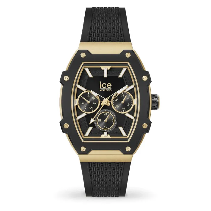 The Ice Watch® Multi Dial 'Ice Boliday - Black Gold' Women's Watch adds a touch of playful elegance to your everyday style. This captivating piece exudes femininity with its sophisticated black and gold color scheme, making it the perfect accessory for any occasion. The casual design of the watch is versatile, allowing you to pair it effortlessly with both your chic office attire and laid-back weekend looks. Crafted with precision, this timepiece features a durable aluminum case, measuring 45mm in length and 35mm in width. The tonneau style enhances its charm and modern appeal, while the mineral glass window ensures you can see the stunning black dial clearly, featuring a multi-dial display that adds functionality without sacrificing style. With a case thickness of just 11mm, it sits comfortably on your wrist. The black silicone band, measuring 19cm in length and 19mm in width, provides a soft touch and ensures a perfect fit. A reliable buckle clasp keeps it securely in place, allowing you to wear it with confidence throughout the day. With a water resistance of up to 5 bars, this watch is suitable for everyday use, including light swimming. The day-date feature adds practicality, ensuring you're always in touch with time. Weighing in at just 50 grams, the Ice Boliday watch is light enough to wear all day long, making it an irresistible addition to your watch collection. Whether you're dressing up or down, this timepiece is set to become your go-to companion, reflecting your unique style with every glance at the time. Shop Ice Watch 022865 at Ormoda