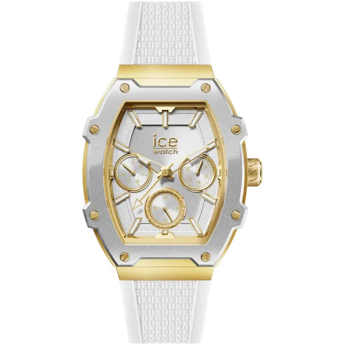 The Ice Watch® Multi Dial 'Ice Boliday - White Gold' Men's Watch 023897 is a striking blend of style and functionality, perfect for the modern man. This watch captures the essence of casual elegance with its unique tonneau case design, which measures a substantial 50mm in length and 39mm in width. Crafted from durable stainless steel, the golden finish adds a touch of sophistication and ensures this timepiece stands out in any setting. The multi-dial display is not just visually appealing but also practical, allowing you to keep track of time in various formats. The watch face features a pristine white color, protected by mineral glass, enhancing its clarity and resilience against daily wear and tear. Comfort is paramount with this watch, and the white silicone band, measuring 21cm in length and 21mm in width, ensures a snug yet comfortable fit on any wrist. It is secured with a reliable buckle clasp, allowing for easy adjustments. With a case thickness of 12mm, it has a solid presence on the wrist without being cumbersome. Designed to be water-resistant up to 5 bars, the Ice Boliday will serve you well whether you're at the office or enjoying outdoor activities. This timepiece is not just about keeping time; it’s about making a statement as you embrace every moment with confidence.