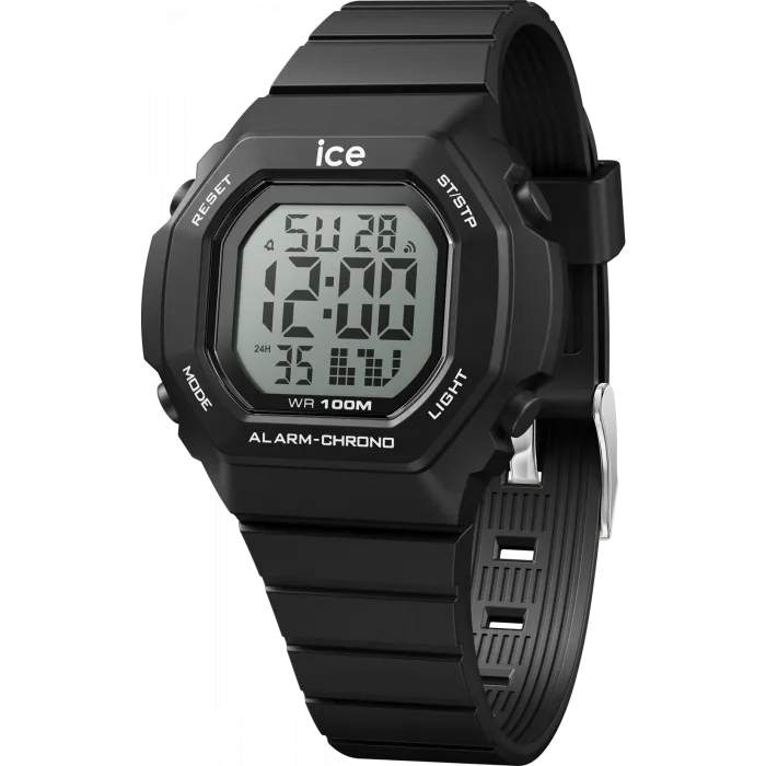 The Ice Watch® Digital 'Ice Digit Ultra - Black' 022094 is a stunning blend of functionality and modern design, specifically tailored for the active lifestyle. Constructed with a durable black resin case, this sporty timepiece is both sturdy and lightweight, with a case diameter of 39mm and a thickness of just 11mm. The LCD dial offers a vibrant display, making it not only easy to read but also stylish. With a mineral glass window, the watch is protected against scratches, adding an extra layer of durability to your daily wear. A silicone band in classic black ensures comfort and flexibility, fitting snugly around your wrist with a length of 19cm and a width of 21mm. The buckle clasp provides a secure fit, allowing for unhindered movement whether you're training or enjoying a casual day out. This watch is equipped with a variety of additional features, including a stopwatch, dual time, alarm, and light, ideal for those who appreciate practicality. It boasts an impressive water resistance of up to 10 bars, making it suitable for swimming or water sports. Designed for unisex appeal, the Ice Digit Ultra combines modern technology with sporty aesthetics, making it a versatile accessory for anyone who values both style and performance. This timepiece doesn't just tell time; it elevates your lifestyle, providing both essential features and a sleek, contemporary look that can effortlessly transition from sports to leisure, ensuring you’re always ahead of the curve, regardless of the occasion.
