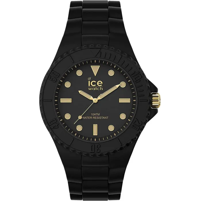 The Ice Watch® Analogue 'Ice Generation - Black Gold' Unisex's Watch is a remarkable fusion of style and functionality. This timepiece is tailored for those who appreciate a modern yet understated aesthetic. Featuring a sleek black silicone case and a sophisticated black dial, it seamlessly blends casual elegance with everyday practicality. The round case, measuring 40mm in diameter, is designed to provide a comfortable fit for various wrist sizes, making it an excellent choice for anyone looking for versatility in their watch collection. The durable mineral glass window guards the dial against scratches while offering an unobstructed view of the time. With a quartz movement, this watch ensures accurate timekeeping, perfect for the busy individual on the move. The Ice Generation watch is not just about looks; it comes equipped with a reliable silicone band that also perfectly complements its overall design. The black band, measuring 21cm in length and 20mm in width, features a classic buckle clasp for secure wear. The lightweight design, weighing only 50 grams, ensures that it sits comfortably on your wrist throughout the day, whether you're at work, running errands, or relaxing on the weekend. With a water resistance rating of 10 bars, you can wear this watch confidently while enjoying various water activities, from swimming to showering, without worrying about water damage. This watch transcends the boundaries of casual wear to become a true statement piece suitable for any occasion, making it a must-have accessory for those who value both style and practicality. Experience the seamless blend of fashion and functionality with the Ice Watch® Analogue 'Ice Generation - Black Gold' 019156.