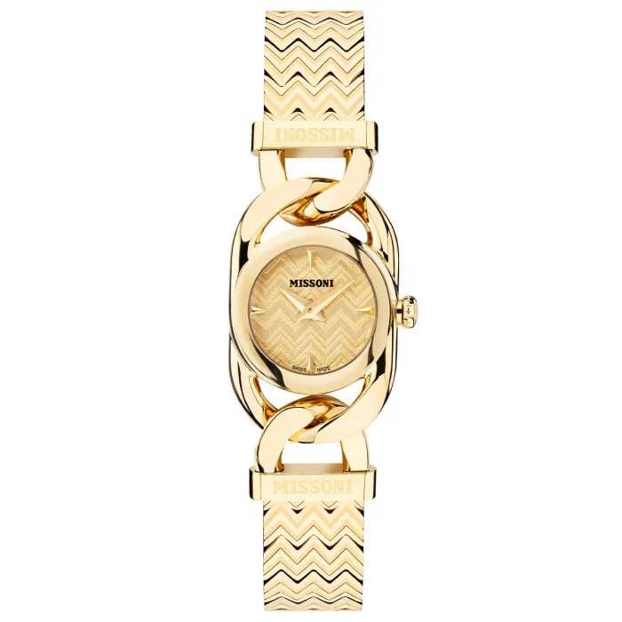 Introducing the MissoniĀ® Analogue 'Gioiello' Women's Watch MWSL01022, a stunning accessory that embodies elegance and sophistication in every detail. This distinguished piece is crafted with a gold stainless steel case, featuring a round design with a 22mm diameter and an 8mm thickness, ensuring a delicate yet sturdy silhouette. The exquisite gold dial, protected by sapphire glass, radiates a luxurious glow and offers an effortless glimpse into time, boasting an analogue display that is both functional and chic. The watch is powered by a reliable quartz movement, ensuring precise timing while maintaining a timeless aesthetic. The gold stainless steel band stretches out to 19cm, perfectly balancing comfort with style, while the 14mm width adds a refined touch. With a deployment clasp fastening, this watch is easy to wear, securely resting on your wrist. Designed for the modern woman, the MissoniĀ® 'Gioiello' is not just a timepiece but a statement of taste and luxury. Itās water-resistant up to 3 bars, making it versatile for various occasions, from elegant soirĆ©e to a casual brunch. This watch combines practicality with exquisite style, making it an ideal complement to any outfit, enhancing your overall elegance and completing your look flawlessly. Shop Missoni MWSL01022 at Ormoda