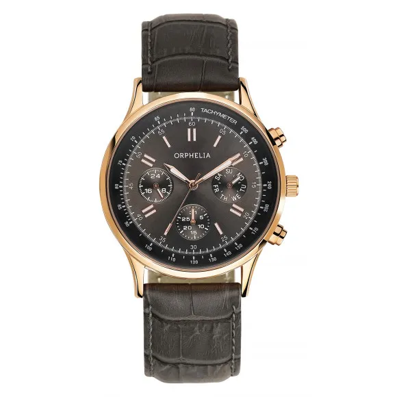 Orphelia® Multi Dial 'Champions League' Men's Watch OR81507 is the perfect embodiment of style and performance. This dynamic timepiece showcases a sophisticated build that caters to the modern man. The watch features a stunning rose gold stainless steel case measuring 42mm in diameter and 12mm in thickness for a robust yet elegant presence on the wrist. Its round design is complemented by a chic grey dial, which is not only stylish but practical with luminous hands and numbers, ensuring readability in low light conditions. The addition of a tachymeter and 24-hour display elevates the functionality, making this watch ideal for those who lead an active lifestyle and appreciate precision. The leather band, also in a striking grey, enhances the overall aesthetic while providing comfort with a length of 20cm and a width of 22mm. Securely fasten it with the buckle clasp and revel in the confidence it inspires. This watch is water-resistant up to 5 bars, providing peace of mind for day-to-day activities. With its multi-dial display, the Orphelia® Champions League truly stands out as a versatile accessory that complements both casual and professional attire. Whether for work or leisure, this timepiece speaks of refined taste and a passion for excellence.Shop Orphelia OR81507 at Ormoda