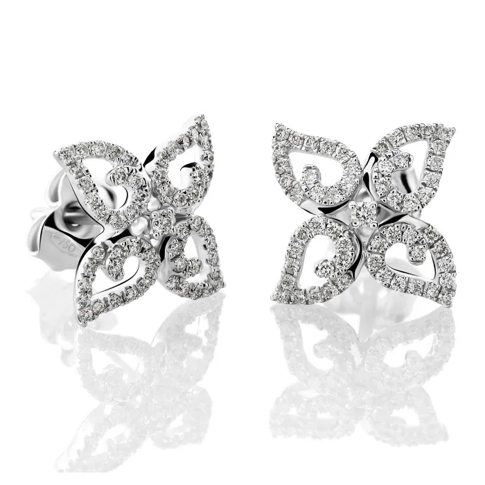 Discover elegance with the Orphelia® 'Charlene' Women's Whitegold 18C Stud Earrings - Silver OD-5321, a true masterpiece designed for the discerning woman. These exquisite earrings are crafted from 18-carat white gold, exuding a luxurious sheen that seamlessly complements any outfit, from day to night. The brilliant cut diamonds are set using an ajourfassung technique, ensuring that each facet sparkles with brilliance and clarity. With a total diamond weight of 0.36 carats and a total of 114 diamonds, these earrings are not only a statement piece but also a testament to exceptional craftsmanship. The diamonds are of small inclusions clarity, categorized as SI1, and possess a color grade of White/Wesselton, characterized by their pristine white hue. Each earring measures 1.4 cm in width and length, making them the perfect size for elegant everyday wear or special occasions. The secure butterfly back finding ensures a comfortable fit that allows you to wear these stunning earrings all day long. Whether you're treating yourself or looking for the perfect gift, the 'Charlene' earrings will undoubtedly leave an unforgettable impression.