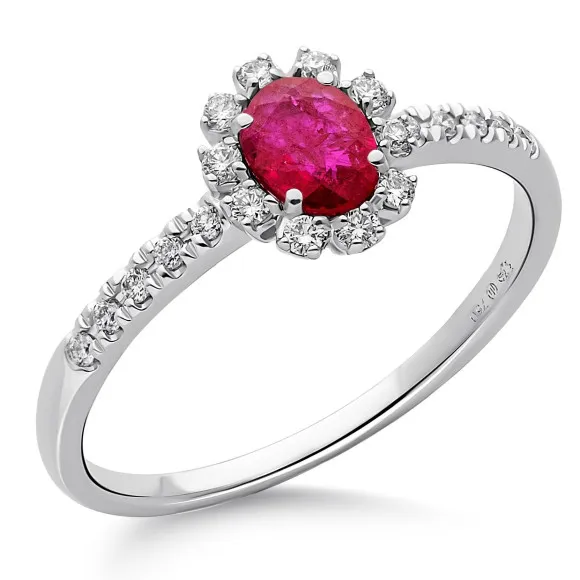 Experience the epitome of elegance with the Orphelia® Women's Whitegold 18C Ring - Silver RD-3928/RU. This exquisite piece showcases a stunning 18-carat white gold structure, harmonizing perfectly with a lavish array of diamonds and a captivating ruby centerpiece. Designed specifically for the modern woman who appreciates luxury, this ring combines sophistication with a touch of glamour. Each diamond is meticulously set in a prong setting, ensuring they sparkle with every movement, while the striking ruby adds a bold splash of color that symbolizes love and passion. With a total gem weight of 0.43 carats, including 0.14 carats of dazzling diamonds, this ring makes a statement of refined taste and individuality. The oval shape of the ring is designed to comfortably fit your finger, with dimensions of 0.8 centimeters in height and 0.6 centimeters in width. Its clean lines and intricate detail reflect the artistry of Orphelia, a brand synonymous with timeless elegance. This piece is lightweight at just 1.70 grams, making it an ideal choice for everyday wear while still being perfect for special occasions. The white gold gleams with a refined glow, affirming its place as a staple in any jewelry collection. Allow yourself to indulge in the luxury of the Orphelia® Women's Whitegold 18C Ring - Silver, where every facet tells a story of craftsmanship and beauty.