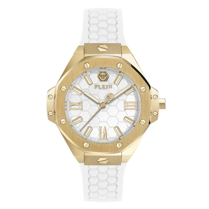 Discover the exquisite elegance encapsulated in the Philipp Plein® Analogue 'Plein Lady Royal' Women's Watch PWBDA0224. Crafted for the modern woman who admires the finer things in life, this timepiece seamlessly blends luxury with functionality. The round watch case, composed of sturdy stainless steel and radiating a stunning gold hue, measures a generous 39mm in diameter and 10mm in thickness, making it a perfect statement piece for any occasion. Its classic white dial provides a striking contrast against the radiant case and is protected by mineral glass, ensuring durability and a clear view of time. Comfort is paramount, and this watch embraces it beautifully with a soft silicone band in pristine white, measuring 19cm in length and 20mm in width. The buckle clasp guarantees a secure fit, adding to the trust you can have in this luxurious accessory. With an ATM rating of 5 bars, it proves to be a reliable companion, resisting splashes and brief immersion in water, perfect for your busy lifestyle. The precise quartz movement guarantees accurate timekeeping, allowing you to remain punctual and stylish all day long. Weighing only 85 grams, this watch feels delightful on the wrist, making it a joy to wear from dawn to dusk. The Plein Lady Royal is not just a watch; it is a blend of sophisticated style and impeccable quality designed for the discerning woman who appreciates timeless luxury. Elevate your accessory collection with this stunning piece that celebrates femininity and grace.Shop Philipp Plein PWBDA0224 at Ormoda