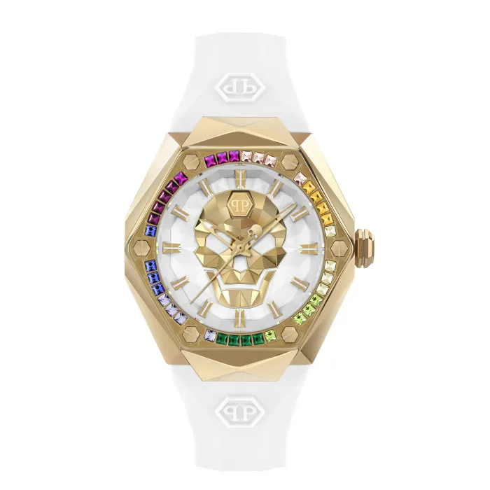 Immerse yourself in the luxurious world of Philipp Plein with the stunning $kull Spikes Women's Watch PWADA0324. This exquisite timepiece is a perfect marriage of style and functionality, designed for the modern woman who commands attention. The watch boasts a striking 40mm round case crafted from premium stainless steel, gleaming in a sophisticated gold tone that provides a stunning contrast to the white dial. The watch dial is protected by high-quality mineral glass, ensuring durability while enhancing visibility as you go about your day. The unique stone settings on the watch bezel add an enviable sparkle, making it a true statement piece. The movement is a reliable quartz mechanism, promising precision and longevity. The watch band is formed from comfortable silicone, allowing for a perfect fit around the wrist. With a length of 19cm and a width of 21mm, it hugs your wrist elegantly, secured by a classic buckle clasp for easy adjustments. Not only is the $kull Spikes visually arresting, but it is also equipped to take on daily challenges with an impressive water resistance of 5 bars. Philipp Plein has garnered a reputation for edgy luxury, artfully incorporating elements that resonate with those who dare to be bold. This watch personifies that ethos, offering a luxurious aesthetic that complements both everyday and formal ensembles. Be it a business meeting or a night out, the $kull Spikes Women's Watch will elevate your style to unparalleled heights.Shop Philipp Plein PWADA0324 at Ormoda