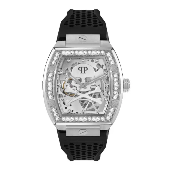 Introducing the Philipp PleinĀ® Analogue 'The $keleton' Men's Watch PWBAA1323, a luxurious masterpiece that effortlessly blends elegance with functionality. Designed for the modern man, this timepiece is a testament to sophistication, featuring a striking silver-toned case that boasts a tonneau shape. With a case diameter of 44mm and a thickness of 14mm, it firmly sits as a statement piece on the wrist. The luxurious appeal is heightened with an intricate stone-set bezel, ensuring that every glance at your watch is met with admiration. As you admire the bold silver dial, protected by scratch-resistant mineral glass, you'll appreciate the automatic movement that keeps perfect time effortlessly. The watch's black silicone band, measuring 21cm in length and 28mm in width, provides comfort along with style, secured by a reliable buckle clasp that speaks of durability and ease. Whether you're dressed for a casual outing or a more formal affair, the design fits seamlessly, embodying versatility and flair. With a water resistance of up to 5 bars, fear not against accidental splashes. This watch is not just a tool; it's an expression of your lifestyle, a companion that reflects both precision and style.