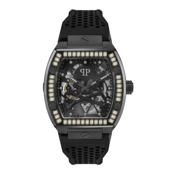 Introducing the Philipp PleinĀ® Analogue 'The $keleton' Men's Watch PWBAA1923, a perfect marriage of sophistication and style. This striking timepiece is artfully designed for the modern man who values luxury and wants to make a statement. The watch includes an automatic movement, ensuring precision and reliability while exuding confidence in every tick. The case boasts a bold black color crafted from high-quality stainless steel, designed in a tonneau shape, offering both uniqueness and comfort on the wrist. With a case diameter of 44mm and a thickness of 14mm, it is substantial yet refined, making it a versatile accessory for both casual outings and formal occasions. The captivating black dial is well-protected by mineral glass, providing an elegant backdrop to the intricate design of this watch. The dial features stone settings that catch the light, adding a touch of luxury to its rugged aesthetic. At the same time, the silicone band is not only resilient but also comfortable, measuring 21cm in length and 28mm in width. It comes equipped with a stylish buckle clasp, ensuring a secure fit on your wrist. The watch is rated for water resistance up to 5 bars, making it a practical choice for everyday wear without sacrificing style. This timepiece is more than just a watch; it is a statement of power and sophistication, perfect for the man who confidently strides through life.