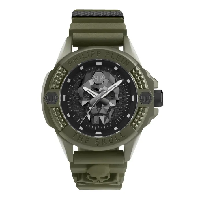 Introducing the Philipp PleinĀ® Analogue 'The $kull Ecoceramic' Men's Watch PWUBA0423, a perfect blend of style and functionality. Designed for the fashion-forward man, this watch embodies an edgy sophistication that stands out. The unique case is crafted from durable resin, ensuring a lightweight yet robust feel which complements the striking green color. Measuring 44mm in diameter and 14mm in thickness, the round case is not just an accessory but a statement piece. The matte black dial adds a hint of mystery and is protected by mineral glass, safeguarding it against scratches and everyday wear. The watch displays time effortlessly with its analogue format, making it easy to read and maintain your schedule. The green silicone band, measuring 21cm in length and 24mm in width, provides a comfortable and secure fit on your wrist, secured with a classic buckle clasp. Its robust construction meets a water resistance of up to 5 bars, perfect for everyday adventures without the worry of moisture. At just 68 grams, the lightweight design ensures that you can wear it all day long without discomfort. This timepiece is crafted for men who appreciate quality and want to embrace a unique aesthetic that reflects their personality. Stand out from the crowd with the unmistakable style of Philipp Plein, where luxury meets boldness. Feel confident with every glance at your wrist, as this watch not only serves a practical purpose but also elevates your fashion game significantly. Whether you're dressing up for a special occasion or keeping it casual, this timepiece will seamlessly blend into your lifestyle. The Philipp PleinĀ® Analogue 'The $kull Ecoceramic' is more than just a watch; it's a reflection of your individuality and style. Shop Philipp Plein PWUBA0423 at Ormoda