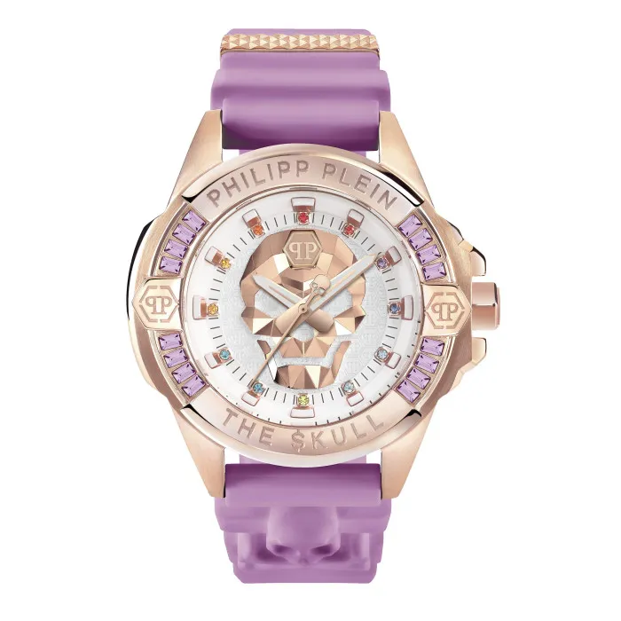The Philipp PleinĀ® Analogue 'The $kull Genderless' Unisex's Watch PWNAA0222 is a daring statement piece that embodies the essence of modern luxury. This watch captures attention with its striking design and impeccable craftsmanship. The round case, made of durable stainless steel and finished in a trendy rose gold, perfectly complements the vibrant lilac silicone band. Measuring 41mm in diameter with a thickness of 11.25mm, it sits comfortably on the wrist, making it suitable for everyday wear. The watch's quartz movement ensures precise timekeeping, while the analogue display offers a classic touch that adds to its overall appeal. The watch features a captivating white dial protected by mineral glass, making it both stylish and resilient against scratches. One of its standout elements is the stone settings along the bezel, adding a hint of glam to the casual style. With a water resistance of up to 5 bars, this timepiece is designed to withstand splashes and brief immersion in water, aligning with the active lifestyle of its wearer. The 20cm length and 20mm width of the silicone band not only provide comfort but are also adjustable, enhancing the user experience. This versatile wristwatch perfectly marries functionality with an edgy design, making it suitable for anyone looking to express their unique style and embrace bold fashion choices.
