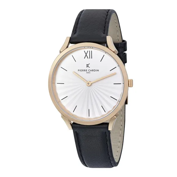 The Pierre Cardin® Analogue 'Pigalle Plissée' Unisex's Watch CPI.2003 is a magnificent fusion of style and functionality. Designed for the modern individual, it embodies the impeccable elegance that Pierre Cardin is known for. The casual design is perfect for daily wear, while its sophisticated aesthetic makes it an ideal companion for special occasions. The watch features a stunning rose gold stainless-steel round case with a diameter of 40mm and a thickness of just 6.55mm, ensuring a comfortable fit on your wrist. Its pristine white dial, protected by durable mineral glass, allows for easy readability while adding a touch of class. The watch is powered by a reliable quartz movement, promising accurate timekeeping for your hectic lifestyle. The black leather band complements the watch perfectly, measuring 18mm in width and extending 21cm in length, ensuring a snug and secure fit. With a lug-to-lug height of 45mm, it sits comfortably on the wrist, making it an ideal accessory for both men and women. This timepiece is also water-resistant up to 3 bars, providing you with peace of mind against splashes and brief immersion. The elegant buckle clasp adds a practical touch, allowing for easy adjustments. With the Pierre Cardin® Analogue 'Pigalle Plissée', you're not just wearing a watch, you're making a statement of sophistication and professionalism.