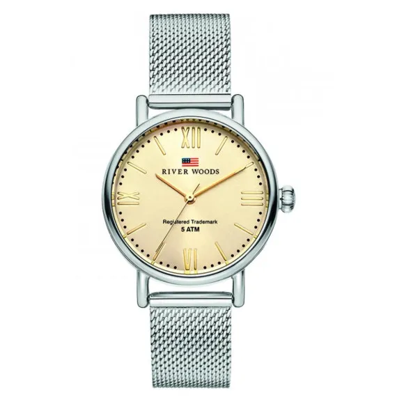 Introducing the River Woods Analogue 'Wisconsin' Women's Watch RW340035, a perfect blend of elegance and chic style. Designed for modern women, this beautiful timepiece features a lustrous gold dial, accentuated by the stainless steel case and bracelet. The round case, measuring 34mm in diameter and 9mm in thickness, is not just stylish but incredibly durable, promising to keep up with your busy lifestyle. The watch showcases a quartz movement that ensures precision, making this an ideal accessory for any occasion, whether it be a formal event or a casual outing.Shop River Woods RW340035 at Ormoda
