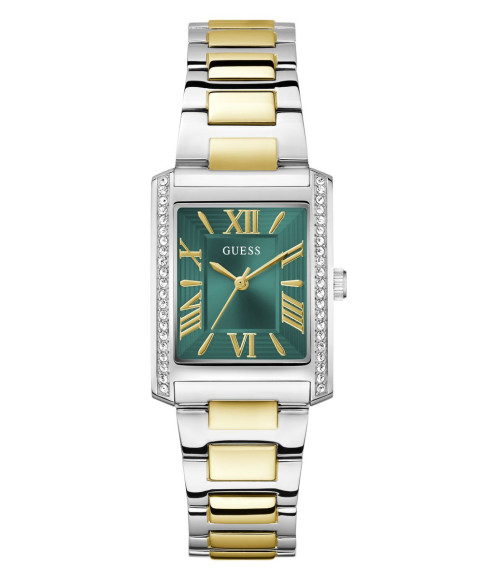 Indulge in the elegant charm of the Guess® Analogue 'Bonnie' Women's Watch GW0874L2, a refined timepiece designed to capture the essence of modern sophistication. Constructed from durable stainless steel, this watch features a sleek rectangular case, which measures 27mm in width and 37mm in length, making it perfectly proportioned for the feminine wrist. With a thickness of just 8mm, it effortlessly balances a bold statement with a delicate appearance. The captivating green dial, protected by mineral glass, showcases a unique design, enhanced with intricately set stones that add a touch of glamour to its overall aesthetic. The vibrant multicolour band, crafted from stainless steel, complements the watch case beautifully, adding an extra layer of elegance. It measures 19cm in length and 18mm in width, making it adjustable for a comfortable fit. The fold-over push button clasp ensures secure fastening, allowing you to embrace each day with confidence. With a water resistance of up to 3 bars, this watch not only embodies style but is also practical for everyday wear. Underneath, the reliable quartz movement guarantees accuracy, keeping you punctual whether you're at work or enjoying a night out. This exquisite piece is not just for telling time, but a fashion statement that will elevate your outfit to new heights. The Guess® Analogue 'Bonnie' is designed for women who appreciate intricacy and elegance in their accessories. It’s the perfect companion for any occasion, making you feel truly special every time you wear it.Shop Guess GW0874L2 at Ormoda