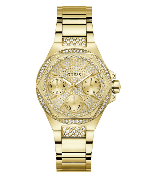 The Guess® Multi Dial 'Envy' Women's Watch GW0878L2 is a stunning piece that exudes elegance and sophistication. This exceptional watch features a quartz movement, ensuring precise timekeeping. With a charming gold round case made of durable stainless steel, measuring 38 mm in diameter and 10 mm in thickness, it is designed to be not just a timepiece but also a statement accessory. The gold dial is beautifully eye-catching, complemented by stone settings that add a touch of luxury and glamour. A mineral glass protects the dial while enhancing its overall aesthetic. Featuring a convenient day-date calendar, this watch keeps you informed while looking effortlessly chic. The watch band is also made of stainless steel in a matching gold tone and has a length of 19 cm and a width of 19 mm, making it comfortable for everyday wear. Not only does it stand out with its unique multi dial display, but it is also water-resistant up to 3 bars, ensuring durability and reliability. This captivating timepiece is designed for women who are confident and stylish. It's perfect for both casual outings and formal events, allowing its wearer to express her personality with grace and poise.Shop Guess GW0878L2 at Ormoda