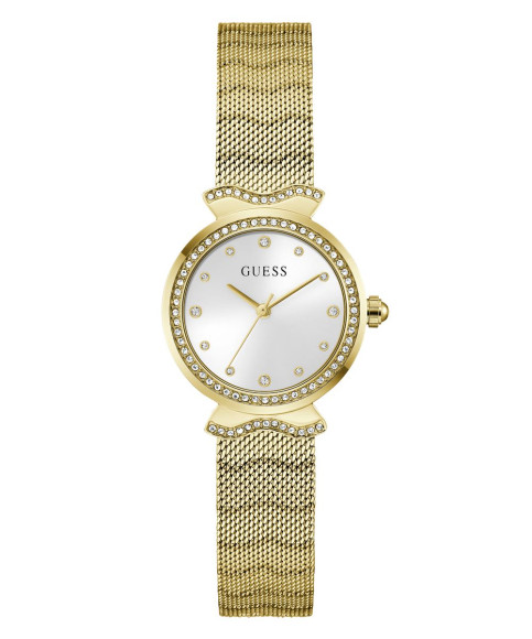 Introducing the Guess® Analogue 'Mermaid' Women's Watch GW0866L2, a timeless masterpiece that beautifully harmonizes elegance and sophistication. Perfectly crafted for the modern woman, this watch features a stunning round case made from high-quality stainless steel, measuring 28mm in diameter and only 8mm thick, making it an ideal companion for any occasion. The luxurious gold tone of both the case and the band exudes a charming allure that enhances your natural beauty. With a band measuring 19cm and 14mm in width, adorned with a stylish folding clasp, comfort and style go hand in hand with this exquisite timepiece. The watch is designed for those who appreciate the finer things in life, featuring a lovely white dial that showcases a classic analogue display. Protecting the dial is a durable mineral glass window, ensuring longevity and resistance to scratches. What truly sets this piece apart is its stunning stone-set bezel, adding a touch of sparkle that is sure to capture attention and elevate your outfit. With a water resistance of up to 3 bars, this watch is as practical as it is beautiful, ensuring you can wear it confidently in various settings—from casual outings to more formal events. Every detail of the Guess® Analogue 'Mermaid' Women's Watch has been thoughtfully designed with you in mind, making it the perfect accessory for every woman who embraces her unique style and wants to shine bright in every moment.Shop Guess GW0866L2 at Ormoda