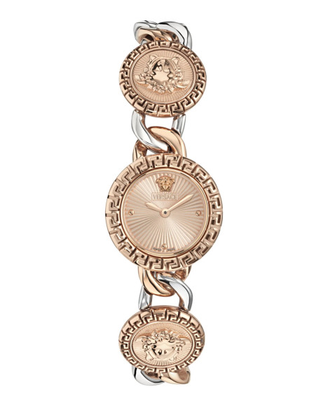 The VersaceĀ® Analogue 'La Greca Stud Icon' Women's Watch VE0Q00225 is a stunning embodiment of elegance and modern style. This exquisite timepiece features a round watch case crafted from durable stainless steel, boasting a radiant rose gold color that radiates sophistication and grace. With a diameter of 28mm and a thickness of 8mm, it is perfectly sized for the feminine wrist, creating a striking yet comfortable fit. The beautiful sunburst rose gold dial is protected by sapphire glass, ensuring both beauty and durability for everyday wear. The intricate design extends to the multicolored stainless steel band, measuring 19cm in length and 14mm in width. This watch features a folding clasp for easy wear, making it a practical addition to your jewelry collection. The captivating rose gold tones are complemented by Versace's iconic design flair, making this watch an essential accessory for any fashionable woman. Powered by precise quartz movement, the 'La Greca Stud Icon' ensures you stay punctual while making a bold statement. With a water resistance level of 3 bars, this watch is suitable for light splashes and everyday activities, adding to its versatility. The unique design elements, combined with high-quality materials, speak to Versace's commitment to style and craftsmanship, making this watch a delightful gift for oneself or a loved one.Shop Versace VE0Q00225 at Ormoda