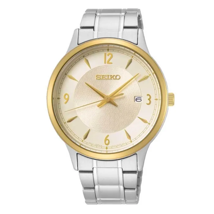 Introducing the Seiko® Analogue Men's Watch SGEH92P1, a stunning piece that effortlessly merges elegance with functionality. This dress watch is designed with the modern man in mind, showcasing a sophisticated silver stainless steel case with a diameter of 40mm and a thickness of only 10mm for ultimate comfort on the wrist. The round case, combined with a brilliant gold dial, instantly draws attention, making it perfect for both formal and casual occasions. The hardlex crystal protects the dial, ensuring durability while allowing for clear visibility of time and date functionalities. The watch also has a water resistance of up to 10 bars, promising resilience against splashes and brief immersion. The silver stainless steel band complements the case, measuring 21cm long and 18mm wide, with a fold-over push-button clasp that guarantees a secure fit. Weighing in at just 110 grams, this timepiece feels light yet robust, making it an excellent choice for daily wear. The quartz movement ensures accurate timekeeping, meaning you won't miss a beat even during your busiest days. Ideal for professionals or anyone who appreciates timeless style and practicality, this Seiko watch is a true testament to craftsmanship and refinement. This watch embodies the perfect combination of classic style and modern innovation, ensuring you always make a statement without uttering a word. Shop Seiko SGEH92P1 at Ormoda