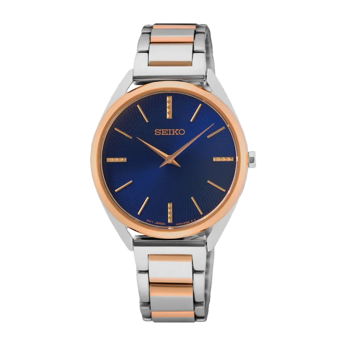 Seiko® Analogue Women's Watch SWR060P1 showcases the gentle charm and elegance that every woman deserves in her collection. This stunning timepiece captivates with a delightful combination of colors, blending creativity and functionality seamlessly. The watch features a round case made of durable stainless steel, displaying a unique multicolour design that reflects the vibrant spirit of a modern woman. With a case diameter of 32mm and a thickness of just 7mm, it sits delicately on the wrist, making it a perfect accessory for both casual and dressy occasions. The enchanting blue dial, protected by a hardlex crystal, provides a beautiful backdrop for the sleek quartz movement that powers the watch with precision. The watch boasts a multicolour stainless steel band, measuring 19cm in length and 14mm in width giving it a comfortable fit. Its fold over with push button clasp ensures that this watch remains securely fastened while providing ease of use. With an impressive water resistance of up to 5 bars, this elegant piece can handle everyday activities, making it not only stylish but practical as well. Seiko® continues to earn its esteemed reputation for crafting timeless pieces that effortlessly blend style and innovation, and the SWR060P1 exemplifies this perfectly.Shop Seiko SWR060P1 at Ormoda