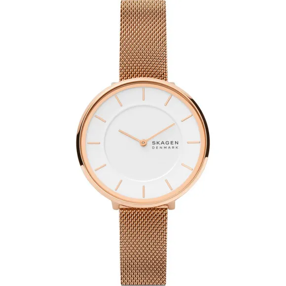 Introducing the SkagenĀ® Analogue 'Gitte' Women's Watch, a stunning blend of elegance and simplicity that embodies the chic, modern aesthetic Skagen is known for. This casual timepiece is designed for women who appreciate a touch of sophistication in their everyday attire. Featuring a round 38mm stainless steel case in a beautiful rose gold hue, it serves as a luminous backdrop for the pristine white dial. The minimalist face is adorned with delicate hour markers, ensuring legibility while enhancing the watch's refined look. The 7mm thickness adds to its delicate appearance, making it a perfect accessory for both formal and casual outfits. Powered by a reliable quartz movement, the Gitte watch guarantees precision and accuracy, essential for today’s busy lifestyle. The mineral glass window provides durability and protection against everyday wear. The watch also boasts a comfortably fitting stainless steel band, measuring 19cm in length and 14mm in width, adorned with the same rose gold finish as the case. The fold-over clasp provides a secure fit, ensuring that you can confidently wear your Gitte watch throughout the day. With an ATM rating of 3 bars, this timepiece can withstand minor splashes, making it not only beautiful but also practical. The Gitte watch is meticulously crafted for women who desire both functionality and style. Whether you're at work, out with friends, or enjoying a lovely evening, let this exquisite watch add a touch of elegance to every moment.