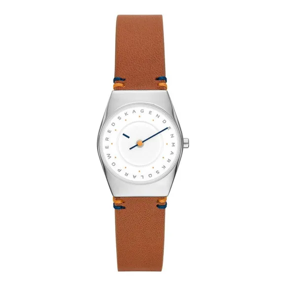 The SkagenĀ® Analogue 'Grenen Lille Solar Disc' Women's Watch SKW3086 is a statement piece that perfectly embodies the essence of contemporary elegance. Designed with the modern woman in mind, this timepiece combines effortless beauty with high functionality. The silver stainless steel case, measuring a delicate 26mm in diameter and only 7mm in thickness, is both lightweight and durable, making it ideal for everyday wear. Encasing a pristine white dial beneath a resilient mineral glass window, this watch ensures clarity and style all day long. The analogue display adds a classic sophistication, while the casual design allows it to effortlessly transition from day to night. Fashioned with a beautiful brown leather band, measuring 19cm, this watch provides a comfortable fit, secured by a reliable buckle clasp. With a width of 16mm, the band complements the sleek case design, enhancing its feminine charm. The watch is also designed to withstand a level of water pressure up to 3 bars, making it suitable for light water exposure, such as splashes or rain. This innovative watch is powered by a reliable quartz movement, ensuring accurate timekeeping to suit your busy lifestyle. The SkagenĀ® Analogue 'Grenen Lille Solar Disc' is more than just a watch; it's an exquisite accessory that reflects your personal style while meeting the demands of your day-to-day activities. Celebrate your individuality and elevate your accessory game with this stunning timepiece.