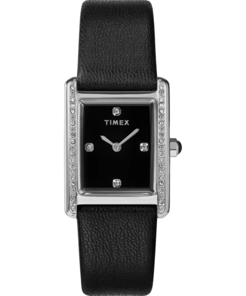 Introducing the stylish Timex® Analogue 'Hailey' Women's Watch TW2W63800, a masterpiece designed to complement any woman's elegance. With a delicate rectangular brass case that gleams with a vibrant silver finish, this watch speaks sophistication and charm. The dimensions are thoughtfully crafted; at just 24mm in diameter and 9mm thick, it sits lightly on the wrist, providing utmost comfort without compromising on style. It features a stunning black dial, protected by mineral glass, which not only enhances its visual appeal but also offers durability for everyday wear. This timepiece showcases intricate stone settings on the bezel, adding a touch of glamour that captures the light beautifully as you move. The watch is powered by a reliable quartz movement, ensuring precision in timekeeping that busy women can depend on. Its sleek black leather band, measuring 19cm in length and 17mm in width, not only contrasts perfectly with the black dial but provides a comfortable fit with a classic buckle clasp. This watch also boasts a water resistance of 5 bars, allowing you to wear it with confidence during your daily activities. The Timex® Analogue 'Hailey' is more than just a watch; it's an expression of femininity and grace, making it a timeless addition to any jewelry collection. Whether dressing up for a special occasion or accessorizing a casual outfit, this watch is an essential piece.