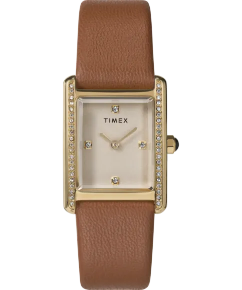 Introducing the Timex® Analogue 'Hailey' Women's Watch TW2W63900, a true embodiment of style and elegance. Designed for the modern woman, this exquisite timepiece combines sophistication with functionality. The watch showcases a stunning beige dial that perfectly complements the opulent gold case. Crafted from durable brass, the rectangular case of 24mm is as sleek as it is chic, making it an ideal accessory for any occasion. The 9mm thickness adds to its delicate appearance, while the stone-set bezel elevates the overall design, creating a captivating visual impact. The watch is equipped with a reliable quartz movement, ensuring precise timekeeping that every woman can rely on. Its mineral glass window not only protects the dial but also enhances clarity, allowing for effortless reading throughout the day. The brown leather band, measuring 19cm in length and 17mm in width, provides a comfortable fit that can be effortlessly secured with the classic buckle clasp. With a water resistance rating of up to 5 bars, this watch is not only stylish but also practical for everyday wear. Weighing in at just 32 grams, the Timex Hailey watch is lightweight and easy to wear, making it the perfect companion for both casual outings and formal events. The meticulous attention to detail in its design guarantees that you will make an impression wherever you go. Experience the fusion of style and reliability with the Timex® Analogue 'Hailey' Women's Watch.Shop Timex TW2W63900 at Ormoda