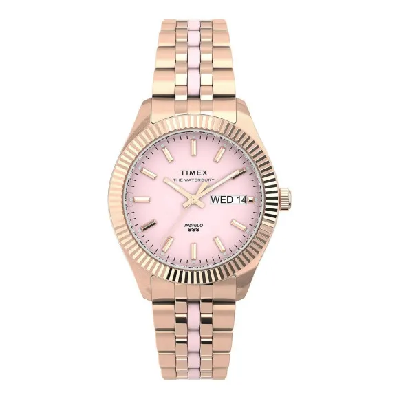 Introducing the Timex® Analogue 'Legacy' Women's Watch TW2U82800, a stunning addition to any fashionable woman's collection. This exquisite dress watch, crafted by renowned watchmaker Timex, embodies a harmonious blend of sophistication and charm. The sparkling rose gold case and band evoke an aura of warmth, while the pink dial adds a romantic touch. Designed for those who appreciate elegance in their accessories, the Legacy watch speaks to both style and quality. Timex has a long history of watchmaking excellence, creating timepieces that are both trendy and reliable. More than a timekeeper, each watch is a statement reflecting individuality and taste, perfect for various occasions. The Legacy watch showcases a sleek 36mm round case made from durable stainless steel, ensuring longevity and a refined look that will never go out of style. Its delicate 10mm thickness makes it comfortable for everyday wear, while the pink dial, protected by mineral glass, provides clarity and sophistication. The day-date feature enhances practicality, making it an ideal accessory for busy women who value both function and style. Additionally, the watch is resistant to water up to 5 bars, allowing for versatility in any environment. The lustrous rose gold band extends to a length of 19cm and a width of 17mm, fitting securely with a fold-over clasp for peace of mind. Each glance at the Legacy watch not only tells the time but also celebrates femininity and elegance, making it a must-have item in any jewelry collection.