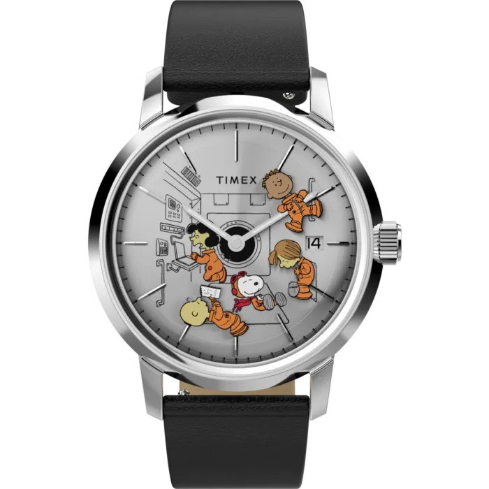 Introducing the Timex® Analogue 'Peanuts Marlin' Men's Watch TW2W87200, where classic charm meets playful design. Inspired by the iconic Peanuts characters, this watch is not just a timepiece but a statement of personality. Crafted with a stainless-steel case, it boasts a polished silver hue that radiates sophistication. The round case measures 40mm in diameter and has a thickness of 13mm, providing a sturdy yet sleek profile perfect for any occasion. A silver dial adorned with whimsical Peanuts motifs adds a touch of fun while ensuring legibility. The mineral glass window offers durability, keeping the watch protected from life's little accidents. The black leather band, measuring 21cm in length and 20mm in width, offers comfort and style, securing the watch with a classic buckle clasp. Moreover, this timepiece is designed to withstand the elements, featuring a water resistance of up to 5 bars, making it suitable for everyday wear, from casual outings to formal gatherings. Weighing in at just 56 grams, it's lightweight and ideal for all-day wear. The automatic movement ensures precision and reliability, turning an ordinary watch into a reliable companion that keeps pace with your busy lifestyle. Whether you're a fan of the Peanuts gang or simply appreciate thoughtful craftsmanship, this watch is engineered to impress.Shop Timex TW2W87200 at Ormoda