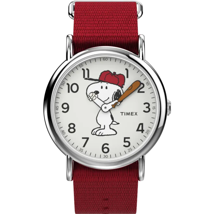Timex brings joy and nostalgia to the forefront with the delightful Peanuts Snoopy Weekender. This unisex watch offers a charming representation of the beloved Peanuts character, Snoopy, perfect for fans of all ages. Designed with versatility in mind, the watch features a classic round silver stainless steel case that measures 38mm in diameter and showcases a sleek thickness of only 9mm. The striking white dial not only highlights Snoopy's playful spirit but also ensures that time-telling is efficient and elegant. Fitted with a durable mineral glass dial window, this watch is built for everyday wear. The vibrant red nylon band adds a pop of color while offering comfort, with a length of 20cm and width of 20mm to ensure a secure fit. The buckle clasp guarantees ease of wear, allowing you to effortlessly slip it on and off. With a water resistance of up to 3 bars, this watch is practical for daily use, ensuring that small splashes or rain won’t compromise its structure. Weighing a mere 46 grams, it provides a lightweight feel that is comfortable throughout the day. Whether you're looking to make a statement or simply want to add a touch of whimsy to your collection, the Timex Peanuts Snoopy Weekender is the perfect choice.Shop Timex TW2R41400 at Ormoda