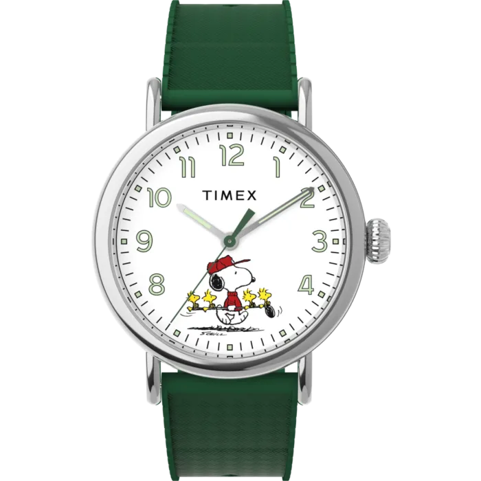 Timex® Analogue 'Peanuts Waterbury Standard' Men's Watch TW2W78900 is a charming tribute to the beloved Peanuts comic strip, integrating playful elements with reliable performance. The watch boasts a classic quartz movement, ensuring precise timekeeping paired with a timeless aesthetic. Its round brass case is elegantly presented in a silver color, enveloping a white dial that features iconic characters and the brand's signature charm. At 40mm in diameter and 13.5mm thick, it strikes a perfect balance between size and comfort, positioned to make a statement without overwhelming the wrist. The mineral glass dial window protects the beautifully designed face with resilience, while the water resistance rating of up to 5 bars means it can withstand splashes and brief immersions, so you can wear it at ease throughout your daily adventures. The band is crafted from durable green rubber, measuring 21cm in length and 20mm in width, where it features a secure buckle clasp for ease of wearing and adjustment. Weighing just 58 grams, this watch seamlessly combines style and practicality. Whether you're dressing up for a business meeting or enjoying a relaxed day out, the Timex® Analogue 'Peanuts Waterbury Standard' is the perfect companion. Its playful design invites a sense of nostalgia, while its functionality asserts reliability, making it an essential accessory for the modern man who appreciates both fun and quality.Shop Timex TW2W78900 at Ormoda