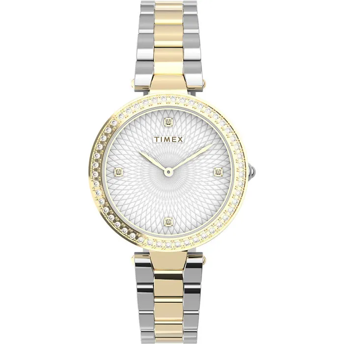 Introducing the Timex® Analogue 'Trend' Women's Watch TW2V24500, a stunning embodiment of elegance and style. This exquisite timepiece features a lustrous gold case crafted from durable brass, exuding luxury while being designed for everyday wear. Measuring a compact 32mm in diameter and only 7mm thick, it fits comfortably on the wrist while making a sophisticated statement. The sleek round bezel is adorned with brilliant stone settings that catch the light beautifully, enhancing its overall allure. The striking white dial, protected by mineral glass, offers clear visibility and ensures that you are always poised with perfect timing. Accompanied by a multicoloured stainless steel band that is not only stylish but also adjustable in length at 19cm, it provides a comfortable fit that adapts to your wrist. With a fold-over clasp featuring a push button for convenience, function meets fashion seamlessly in this elegant watch. Rated for water resistance up to 5 bars, it’s perfectly suited for both casual outings and formal events. The reliable quartz movement ensures accurate timekeeping, allowing you to embrace every moment with confidence. Whether you're dressing up for a special occasion or adding a touch of glamour to your everyday ensemble, this watch is your perfect companion.Introducing Timex® Analogue 'Trend' Women's Watch TW2V24500