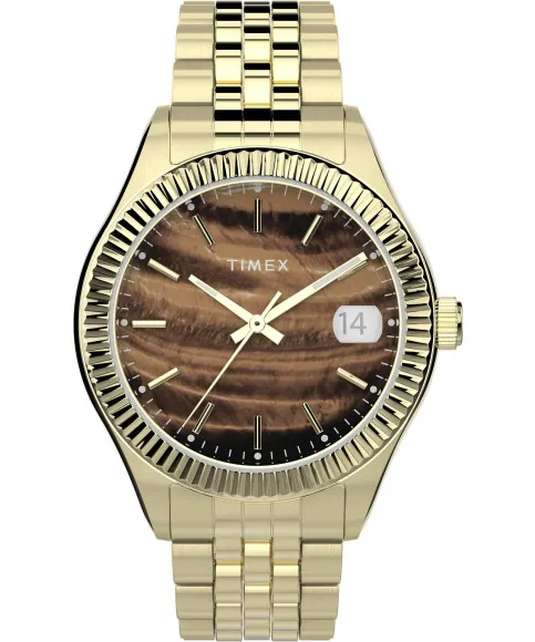 The Timex® Analogue 'Waterbury Legacy' Women's Watch TW2T87100 is a stunning addition to any woman's accessory collection. This exquisite timepiece embodies the classic elegance associated with the Timex brand, taking inspiration from the brand's rich heritage of watchmaking. The Waterbury Legacy collection represents a seamless blend of tradition and modernity, making it the perfect choice for the discerning woman who appreciates both style and function. Crafted from high-quality stainless steel, this watch is durable yet elegant, ensuring it can withstand the test of time while still making a statement. The round case color shines bright in gold, enhancing its luxurious feel, while the brown dial offers a touch of warmth and sophistication. With a diameter of 33mm, it is designed to fit comfortably on a woman’s wrist, striking just the right balance between visibility and subtlety. The mineral glass window protects the delicate dial, ensuring clarity in every glance. The fold-over push-button clasp provides security and ease of use, making it a practical choice for daily wear. Plus, with a date feature and water resistance up to 5 bars, it is as functional as it is beautiful. Whether dressed up for a special occasion or paired with casual attire, this watch is an essential accessory for the modern woman.Shop Timex TW2T87100 at Ormoda