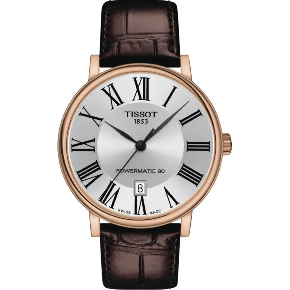 The Tissot® Analogue 'Carson' Men's Watch T1224073603300 is a premium timepiece designed for the discerning gentleman. Crafted with a keen eye for detail, this watch exemplifies elegance and sophistication. The round stainless steel case, finished in a luxurious rose gold, measures 40mm in diameter and is complemented by a sleek silver dial protected by sapphire glass, ensuring durability without compromising on style. The automatic movement guarantees reliable timekeeping, while the detailed calendar function enhances practicality, catering to the modern man's busy lifestyle. The Tissot Carson showcases a stunning brown leather band that wraps comfortably around the wrist, measuring 21cm in length and 20mm in width. It features a classic buckle clasp, enhancing its timeless design. This watch not only boasts versatility, perfectly transitioning from formal to casual occasions, but also presents a water resistance of up to 5 bars, allowing for a lifestyle without limits. At just 10mm thick, the Carson maintains a refined silhouette, while the lug-to-lug height of 45mm ensures a secure fit on the wrist. Weighing 58 grams, this watch is lightweight yet sturdy, making it an ideal companion for daily wear or special events. It is more than just a functional accessory; it's a statement of style and refinement, perfect for the man who understands the importance of both aesthetics and practicality. Make a lasting impression with this remarkable timepiece that perfectly embodies Tissot's commitment to craftsmanship and quality.Shop Tissot T1224073603300 at Ormoda