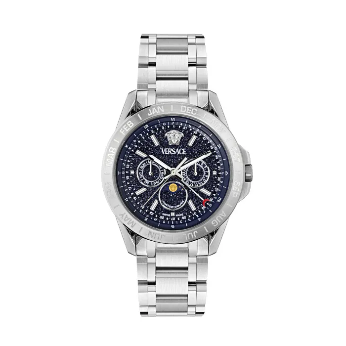 Versace is an emblem of opulence and refined Italian craftsmanship, renowned for its avant-garde designs that inspire confidence and convey modern luxury. The brand's exceptional watches are no exception, embodying artistic creativity, high precision, and glamorous details that elevate everyday wear. Each timepiece reflects the heritage of Versace's legacy, where elegance meets functionality. With a philosophy centered on innovation, Versace continually explores new materials and designs that redefine the concept of luxury watchmaking. The brand embraces bold colors, striking motifs, and innovative engineering, ensuring that every watch is not just a representation of time but also a statement of personality and lifestyle. Collaborating with master artisans, Versace guarantees that every watch is crafted to perfection, making it a coveted accessory for those who appreciate the finer things in life. With a rich history starting from haute couture, the brand seamlessly blends fashion and practicality, ensuring that each piece is suited for the modern man who seeks to express his individuality and status through exquisite craftsmanship. Introducing VersaceĀ® Multi Dial 'Galaxy Moonphase' Men's Watch VE0K00125