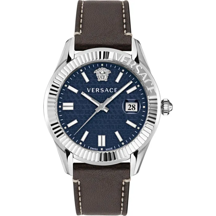 Introducing the VersaceĀ® Analogue 'Greca Time' Men's Watch VE3K00122, a harmonious blend of sophistication and functionality. This dress watch exudes an aura of luxury, making it the perfect accessory for the discerning gentleman. The gleaming silver stainless steel case, with a diameter of 41mm and a thickness of 10mm, showcases a timeless round style that is both elegant and robust. Housing a precise quartz movement, this watch promises reliability and accuracy, ensuring you never miss a moment. The stunning blue dial, protected by sapphire glass, is not only visually striking but also durable, making it suitable for everyday wear and special occasions alike. With a date calendar feature and an analogue display, this timepiece is both practical and stylish. The handsome brown leather band, measuring 21cm in length and 20mm in width, fits comfortably around the wrist and fastens securely with a classic buckle clasp. Whether you are in a boardroom meeting or attending a gala, this watch complements any attire, adding a touch of sophistication to your look. Boasting a water resistance of 5 bars, you can wear it with confidence in various environments, from professional settings to casual outings. The versatility of the Greca Time ensures that it meets the demands of modern life while maintaining a refined essence that speaks to the luxury lifestyle. Elevate your collection with this striking timepiece that embodies the essence of Versace style and craftsmanship. Shop Versace VE3K00122 at Ormoda