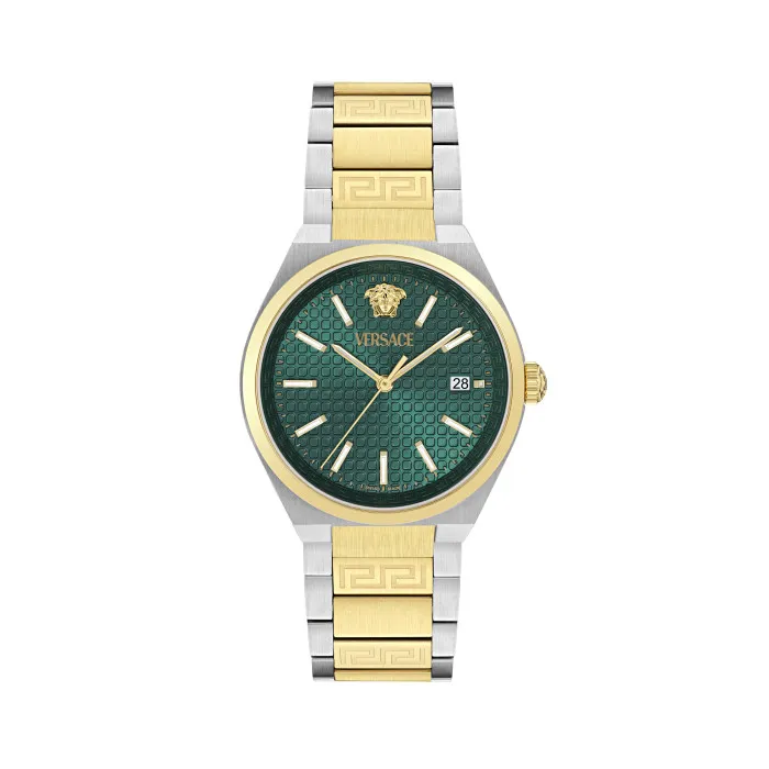 The Versace Analogue 'V-auria' Men's Watch VE0F00425 is an epitome of sophistication and style that seamlessly blends functionality with high fashion. Designed for the discerning man who appreciates luxury, this exquisite timepiece features a captivating multicoloured round case made from stainless steel, boasting a robust diameter of 38mm. Its striking green dial serves as the centerpiece, elegantly protected by sapphire glass that ensures clarity and durability. The movement is powered by a precision quartz mechanism, ensuring that you stay on schedule without sacrificing style.
