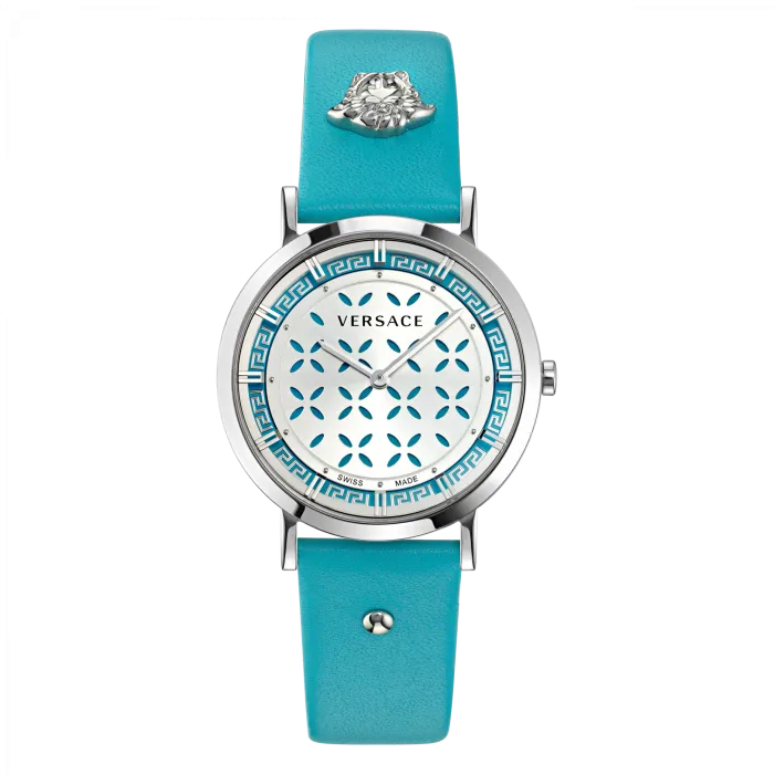 Introducing the VersaceĀ® Analogue 'Versace New Generation' Women's Watch VE3M00823, a splendid epitome of elegance that unites style and craftsmanship. This exquisite timepiece is designed for the modern woman who seeks to adorn her wrist with a blend of beauty and functionality. The silver stainless steel case, with a diameter of 36mm, is beautifully complemented by a delicate 7mm thickness, making it a comfortable fit for any occasion. Its analogue display features a captivating silver dial protected by high-quality sapphire glass, ensuring clarity and durability. The luxurious blue leather band, measuring 19cm in length and 17mm in width, adds a pop of color, bringing life to any outfit. The watch closes securely with a stylish buckle clasp, making it easy to wear while also enhancing your look. With a water resistance of up to 5 bars, this watch is perfect for everyday use without compromising on style. The round case design, combined with sophisticated features, showcases an exquisite attention to detail that is synonymous with the Versace brand. Whether you're attending a glamorous event or simply enjoying a casual day out, this timepiece is the perfect accessory to complete your ensemble. Versace is renowned for its iconic design and luxurious appeal, and this watch embodies those traits with grace. Embrace your unique style with the VersaceĀ® Analogue 'Versace New Generation'. Shop Versace VE3M00823 at Ormoda