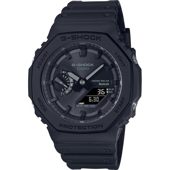 The Casio® Analogue-digital 'G-shock' Men's Watch GA-B2100-1A1ER is an epitome of strength and style in the world of watches. Designed to meet the demands of adventurers, this timepiece combines military-inspired aesthetics with advanced features suited for a contemporary lifestyle. Its robust black resin case, measuring a striking 46mm in diameter, houses an analogue-digital display that effortlessly marries functionality with sophistication. The lightweight construction, weighing only 50 grams, ensures that you'll hardly notice it on your wrist, yet it's built to withstand the rigors of daily wear. The watch's mineral glass dial window is designed for durability, offering protection against scratches and impacts while maintaining clarity. Equipped with a reliable quartz movement, this watch boasts precision in timekeeping, while its innovative features include Bluetooth connectivity for syncing with smartphones, solar power for sustainable energy use, and convenient functions like a stopwatch and world time display. With a water resistance of 20 bars, this watch is not just stylish but also versatile enough for any water-related activities. The comfortable 21cm plastic band is designed for quick adjustments, making it adaptable to various wrist sizes, complemented by a secure buckle clasp. Whether you're scaling mountains or navigating urban jungles, the G-shock Men's Watch is a dependable companion that tells not just the time but also your adventurous spirit.Shop Casio GA-B2100-1A1ER at Ormoda