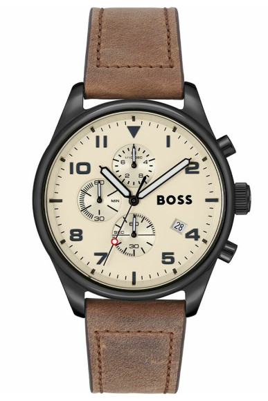 The Hugo Boss® Chronograph 'View' Men's Watch 1513990 is a striking blend of functionality and style that speaks to the modern man. This military-inspired timepiece is designed with precision in mind, showcasing a robust 44mm round stainless steel case that exudes confidence and resilience. Its black case color perfectly contrasts with the elegant beige dial, augmenting readability and enhancing its sophisticated appearance. Designed for the adventurous spirit, this watch features a durable quartz movement that ensures accurate timekeeping, coupled with a date calendar for added practicality. The watch is also water-resistant to 5 bars, allowing for a seamless transition from land to water activities without concern. The luxurious brown leather band adds a touch of classic style and comfort, measuring 21cm in length and 21mm in width, perfect for the discerning gentleman who values both form and function. A safety buckle clasp keeps this timepiece securely in place, while the mineral glass window adds a layer of strength against everyday wear. Weighing in at just 70 grams, the Hugo Boss® Chronograph 'View' feels substantial yet comfortable on the wrist, making it an ideal accessory for both dynamic excursions and formal gatherings. This watch not only delivers high performance but is also a statement of elegance and strength, tailored for men who appreciate luxury in every aspect of their lives.Shop Hugo Boss 1513990 at Ormoda