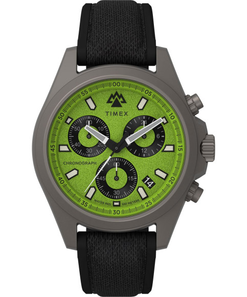 The Timex® Chronograph 'Field Post Chrono' Men's Watch TW2V96400 is a remarkable blend of tactical functionality and classic design. Inspired by military aesthetics, it stands out with a robust grey stainless steel case that measures an ideal 43mm in diameter and 12mm in thickness. Its round shape offers a timeless look while ensuring durability. The captivating green dial features a chronograph display and a conveniently positioned date calendar, making this watch a perfect companion for any man who values precision and style. Protected by sapphire glass, the dial withstands the rigors of daily wear, resisting scratches and ensuring clarity in any situation. The watch is not just about appearance; it boasts an exceptional quartz movement for reliable timekeeping. The black silicone band, measuring 21cm long and 20mm wide, offers both comfort and breathability, perfect for both casual outings and outdoor adventures. Secured with a classic buckle clasp, it embodies practicality and ease of use. With a water resistance of up to 10 bars, the 'Field Post Chrono' can accompany you on all your adventures, whether it be a day at the office or an expedition into the wild. Weighing a mere 86 grams, it feels just right on the wrist without being cumbersome. This timepiece is designed for the modern man who appreciates functionality without sacrificing style.Shop Timex TW2V96400 at Ormoda