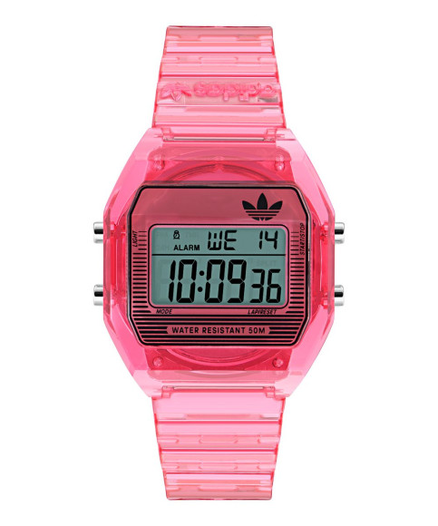Adidas Originals® Digital 'Digital Two Crystal' Unisex's Watch AOST25540 is a striking blend of style and functionality. This timepiece showcases a vibrant pink case, crafted from durable resin that ensures longevity and offers a distinct look on any wrist. With a diameter of 36mm, this sophisticated watch fits comfortably while making a bold statement. The resin band, measuring 20cm in length and 20mm in width, is designed for all-day wear, featuring a secure buckle clasp that provides an adjustable fit. The watch features a digital display, making it easy to read and ideal for those who lead an active lifestyle. You can also stay on top of your busy schedule with its day-date calendar function. This watch is not just about looks; it is equipped with essential additional features such as a stopwatch, countdown timer, alarm, and a light function, showcasing its versatility and practicality. With an impressive water resistance of up to 5 bars, the Adidas Originals Digital 'Digital Two Crystal' is prepared to keep up with your everyday adventures. The watch case is designed to be both fashionable and functional, with a thickness of 10mm and a lug-to-lug height of 42mm, enhancing its overall aesthetic appeal. This unisex model is truly a perfect companion for anyone looking for a stylish and efficient way to keep track of time.Shop Adidas Originals AOST25540 at Ormoda