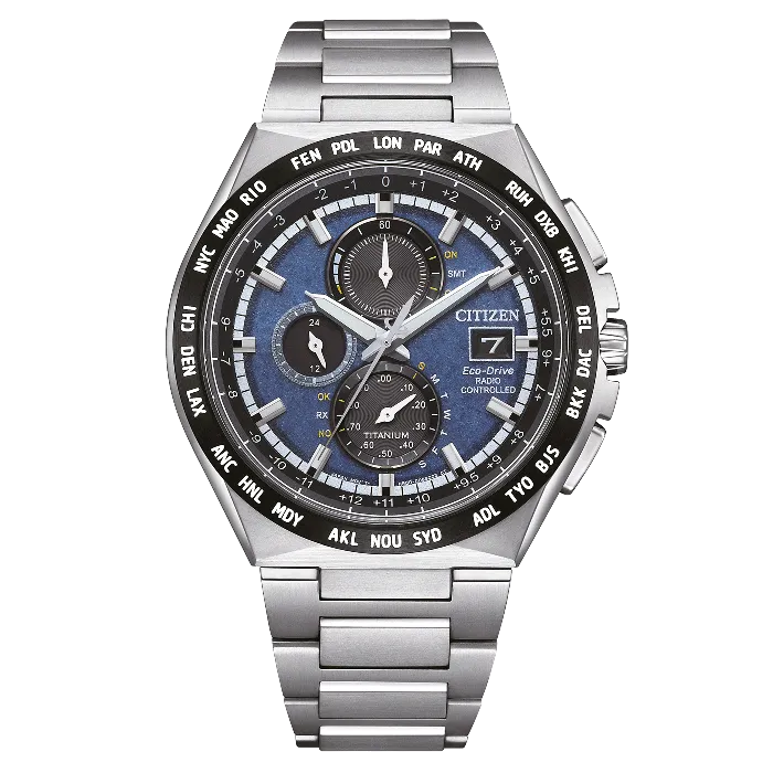 Cette montre de haute qualité est dotée de la technologie eco-drive (rechargeable par toute source de lumière ; pas besoin de changer la batterie). Cette montre chronographe dispose des fonctions suivantes : date, contrôle radio, énergie solaire, chronomètre, affichage 24 heures et aiguilles lumineuses.