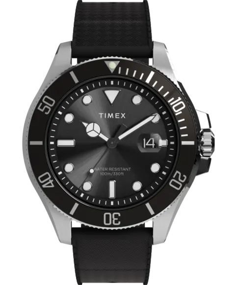 Cette montre inspirée des plongeurs allie élégance et robustesse, avec un boîtier de 44 mm brossé et poli, équipé d’une lunette rotative unidirectionnelle. Cette montre analogique dispose d’une fonction calendrier : date et est équipée de aiguilles lumineuses.