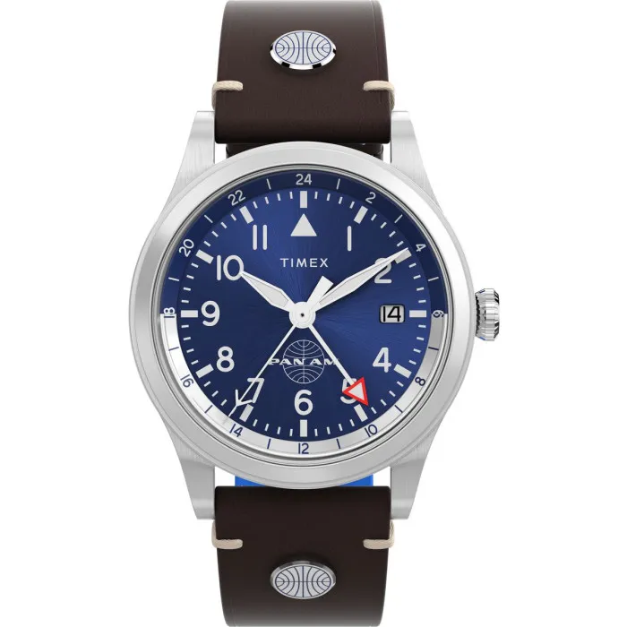 Une collection emblématique de timex prend son envol. En partenariat avec l'une des compagnies aériennes les plus emblématiques au monde, la timex® x pan am® gmt célèbre le riche héritage de voyage aérien du leader de l'industrie. Cette montre analogique dispose d'une fonction calendrier : date, ainsi que d'aiguilles lumineuses.