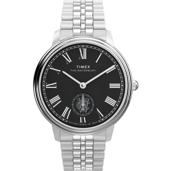 Définie par des lignes nettes et des courbes élégantes, la waterbury sub-second présente un boîtier en acier inoxydable de 39 mm amélioré avec un profil plus mince et une lunette à deux niveaux élégante.