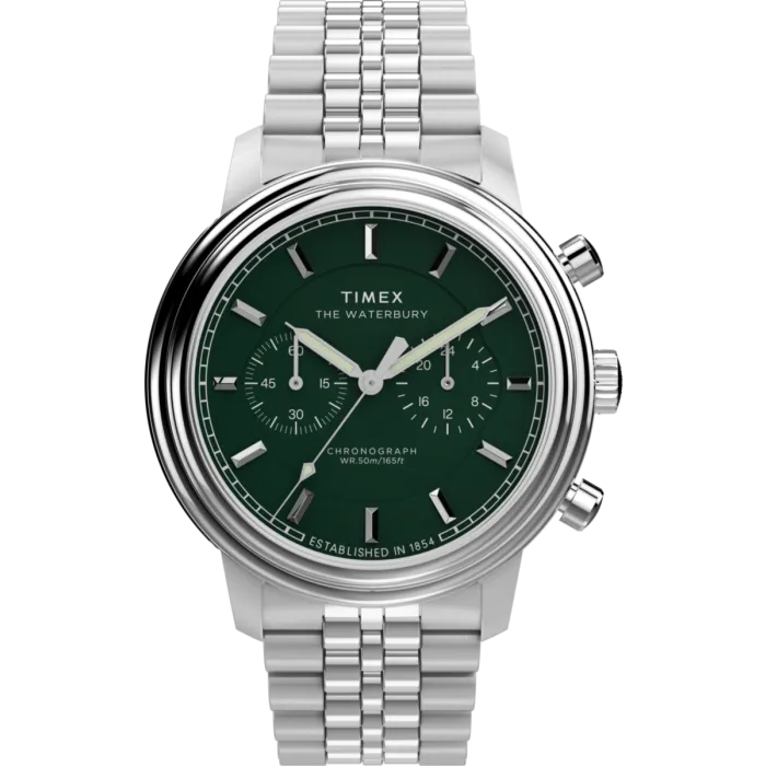 Définie par des lignes nettes et des courbes élégantes, la waterbury metropolitan présente un boîtier en acier inoxydable de 41 mm amélioré avec une lunette à deux niveaux élégante. Cette montre chronographe dispose des fonctions suivantes : chronomètre, affichage 24 heures et aiguilles lumineuses.