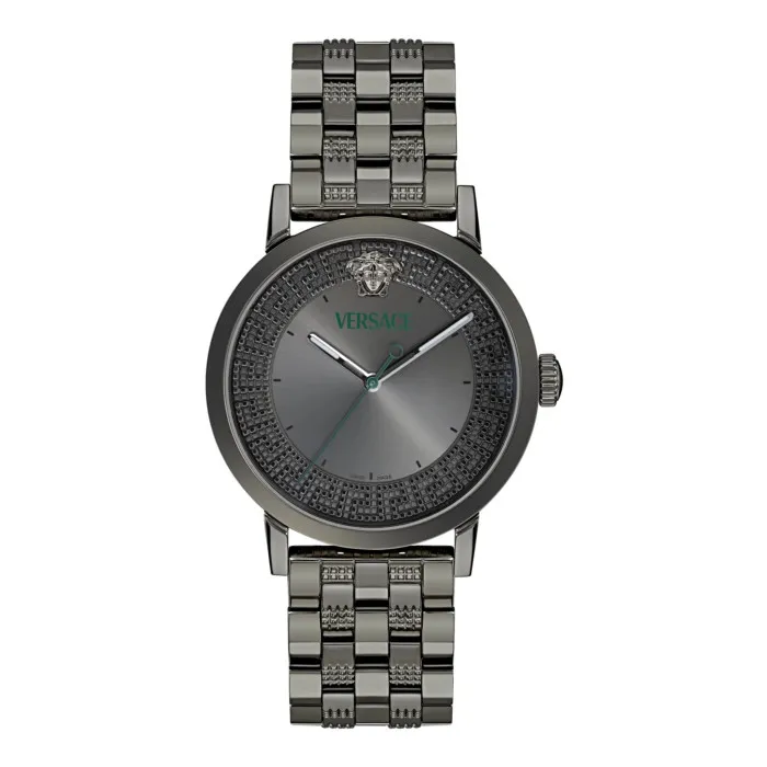 Le design élégant de cette nouvelle montre est enrichi par les clous décorant la bague intérieure, qui recréent le motif greca. Cette montre analogique est équipée d’aiguilles luminescentes et possède un mouvement swiss made.